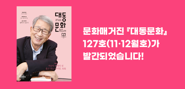 대동문화 127호에서는, 아름다운 경관과 수많은 특산물, 문화예술이 살아 숨쉬는 '보배섬' 진도의 이곳저곳을 소개합니다. 진도의 묵직한 문화재와 다채로운 볼거리를 가득 담았습니다. 표지이야기에서는 평생을 니체 연구자로 살아온 철학가 성진기 교수를 초대해, 서가에 꽂힌 철학이 아닌, 세상 밖에서 생동하는 철학을 배워봅니다. 이 밖에도 김홍곤 조각가의 작품세계와 작업현장을 담은 '아트라이프', 그리운 어머니의 장독을 질박하게 담아낸 이창희 사진작가의 '포토에세이', 대한민국 미용 명장 제1호 김진숙, 손진아 모녀의 이야기를 실은 '아름다운 동행' 등 우리 주변의 이야기들을 한땀 한땀 모아 독자여러분께 보내드립니다.