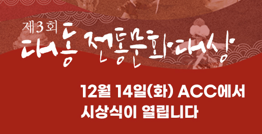 제3회 대동전통문화대상 후보자 공모가 지난 11월 20일자로 마감되었습니다.성원해주신 많은 분들께 진심으로 감사드립니다.수상자는 심사위원회의 심사 후 결정되며, 오는 12월 14일(화) 국립아시아문화전당에서 시상식이 열립니다. 수상자 발표와 시상식에 대한 자세한 사항은 홈페이지와 SNS를 통해 다시 안내드리겠습니다. 감사합니다.