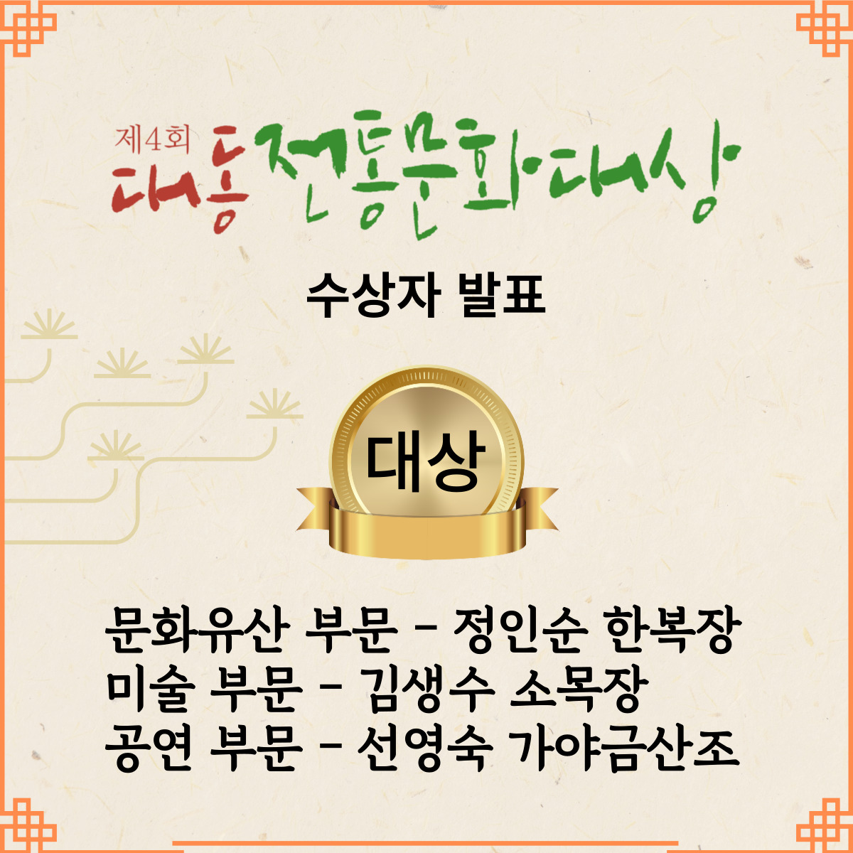 제4회 대동전통문화대상의 수상자가 선정되었습니다. 수상자분들께는 12월 13일, 시상식에서 상금과 상패가 주어집니다. 진심으로 축하드립니다.