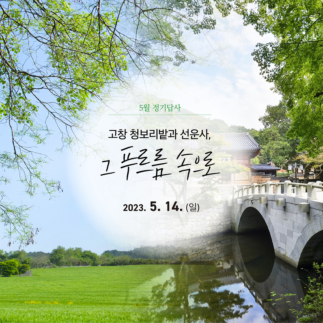 5월 14일 일요일, 전북 고창 일대로 5월 정기답사를 떠납니다. 선운사의 푸르름을 함께 하실 참여자를 모집합니다. 자세한 사항은 홈페이지를 참고해주세요🚌😆