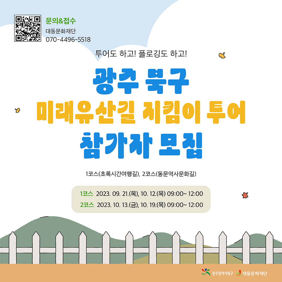 광주 북구에 숨은 보물을 찾아 떠나는 여행, 미래유산길 지킴이 투어의 참여자를 모집합니다. 미래유산 해설을 들으며 쓰레기를 줍는 플로깅까지! 투어에 함께 해보세요! 10월 총 3차례의 일정에 참가하실 수 있습니다. |