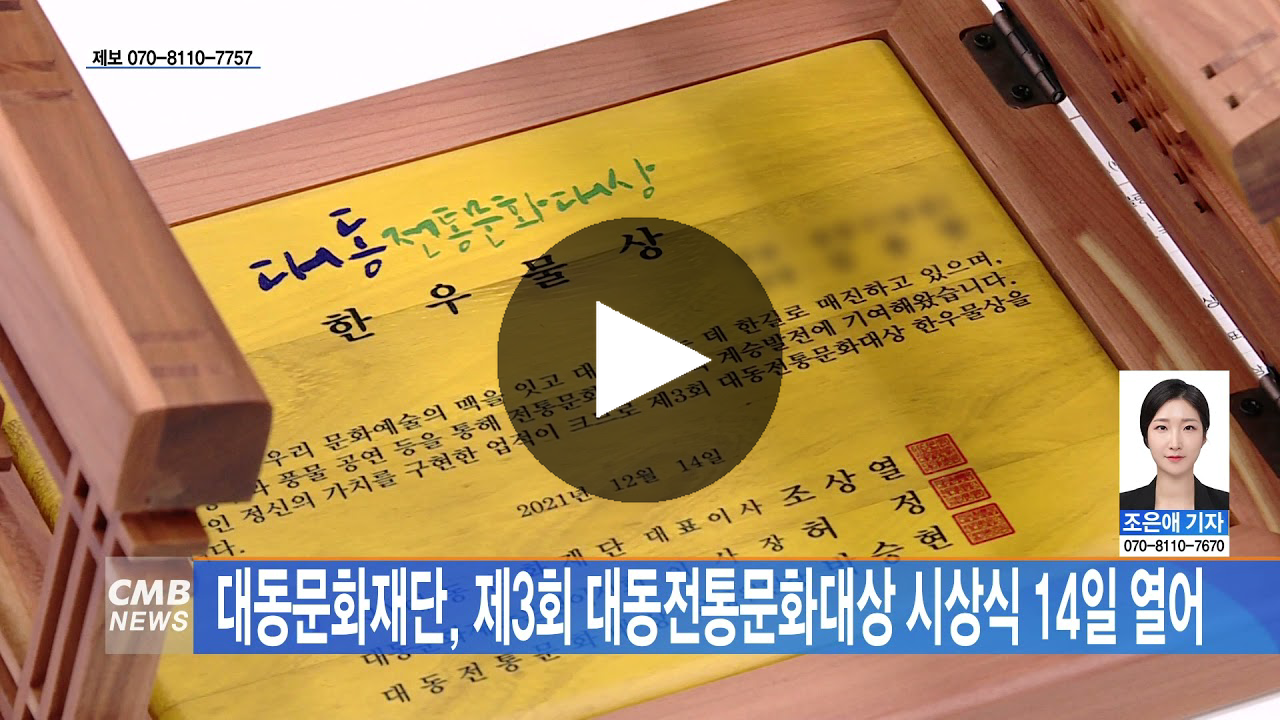 언론 보도 보기 🎥 YTN news '꽃피는 찻사발'·닻배 노래...전통을 잇는 사람들' 🎥 CMB NEWS '대동문화재단, 제3회 대동전통문화대상 시상식 14일 열어' 🎥 CNN21코리아 '제3회 대동전통문화대상 시상식' 현장 영상 🎥KBS NEWS '제 3회 대동전통문화대상' 시상식 개최(보도 영상 보기) 📗 무등일보 2021.12.16. "전통의 맥 잇다" 3회 대동전통문화대상 시상식 성료(기사 읽기) 📗광주매일신문 2021.12.16. '문화유산부문' 김학근, '미술부문' 조재호, '공연부문' 조오환(기사 읽기) 📗광남일보 2021.12.15. 제3회 대동전통문화대상 시상식 '성료'(기사 읽기) 📗채널코리아뉴스 2021.12.15 제3회 대동전통문화대상 시상식 성료(기사 읽기) 📗전남매일 2021.12.14. 대동전통문화대상에 김학근·조재호·조오환(기사 읽기) 앞으로도 우리 전통문화의 가치를 전파하고 계승하기 위해 매진하는 '전통문화 지킴이' 대동문화재단이 되겠습니다. 문화나눔 실천에 함께 해주신 많은 분들께, 또 관심가져주시고 지켜봐주신 모든 분들께도 진심으로 감사드립니다. 올 3회에 이어 앞으로 30회, 100회까지 이어나갈 수 있도록 최선을 다해 준비하겠습니다. 열여덟분의 수상자들께도 다시 한번 축하 말씀 올립니다. 감사합니다. -대동문화재단 대표 조상열 및 임직원 일동 올림-