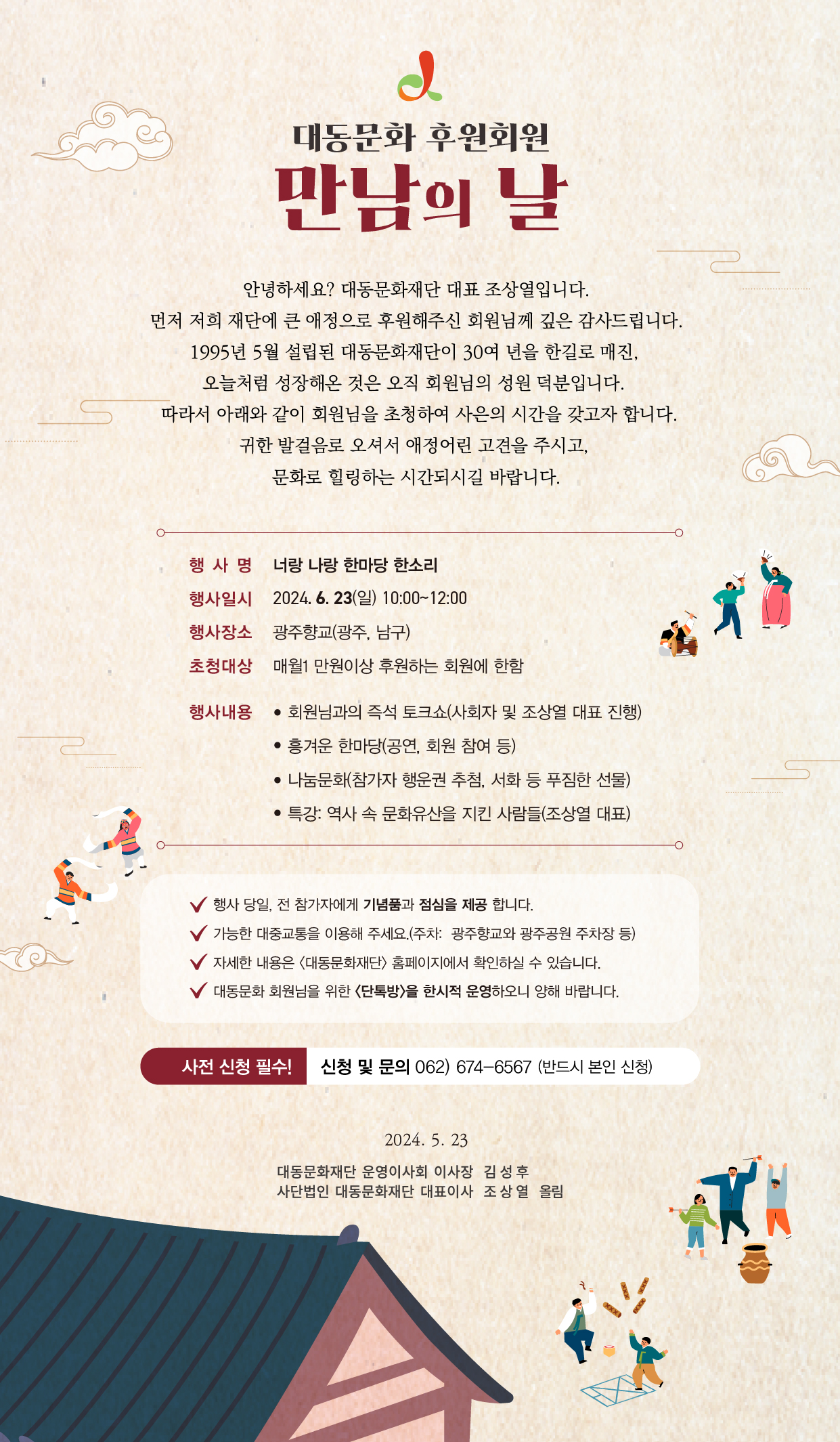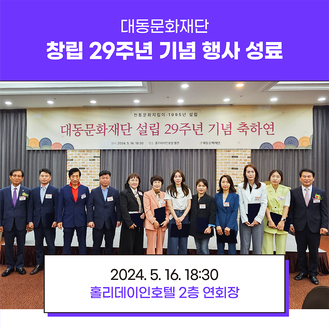 지난 5월 16일 목요일, 광주 홀리데이인 호텔 연회장에서 대동문화재단 설립 29주년 기념 행사가 열렸습니다! 김성후 운영이사장님을 비롯, 역대 이사장님들의 덕담과 축사, 29주년을 축하해주신 내외빈 여러분의 축사, 신규 운영이사님 위촉 등 성황리에 행사를 진행하였습니다. 참석해주시고 축하해주신 분들께 다시 한번 감사드립니다. 더욱 발전하는 대동문화재단이 되겠습니다🙇♀️🙇♂️