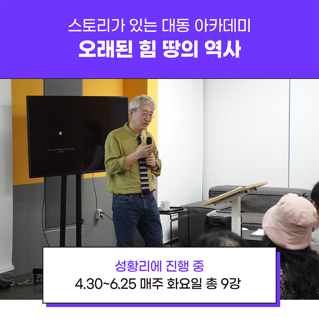 지난 4월 30일, 김봉중 교수님의 첫 수업을 시작으로 매주 화요일 저녁 충장22에서는 열띤 인문학 공부가 계속되고 있습니다. 세계사와 우리 역사, 풍수와 지명, 기후환경과 문학 등 다양한 분야의 명사들을 만나는 인문학 강좌 '대동 아카데미'가 어느덧 절반의 릴레이를 마쳤습니다. 6월 25일까지 네 번의 강의가 계속 진행됩니다!