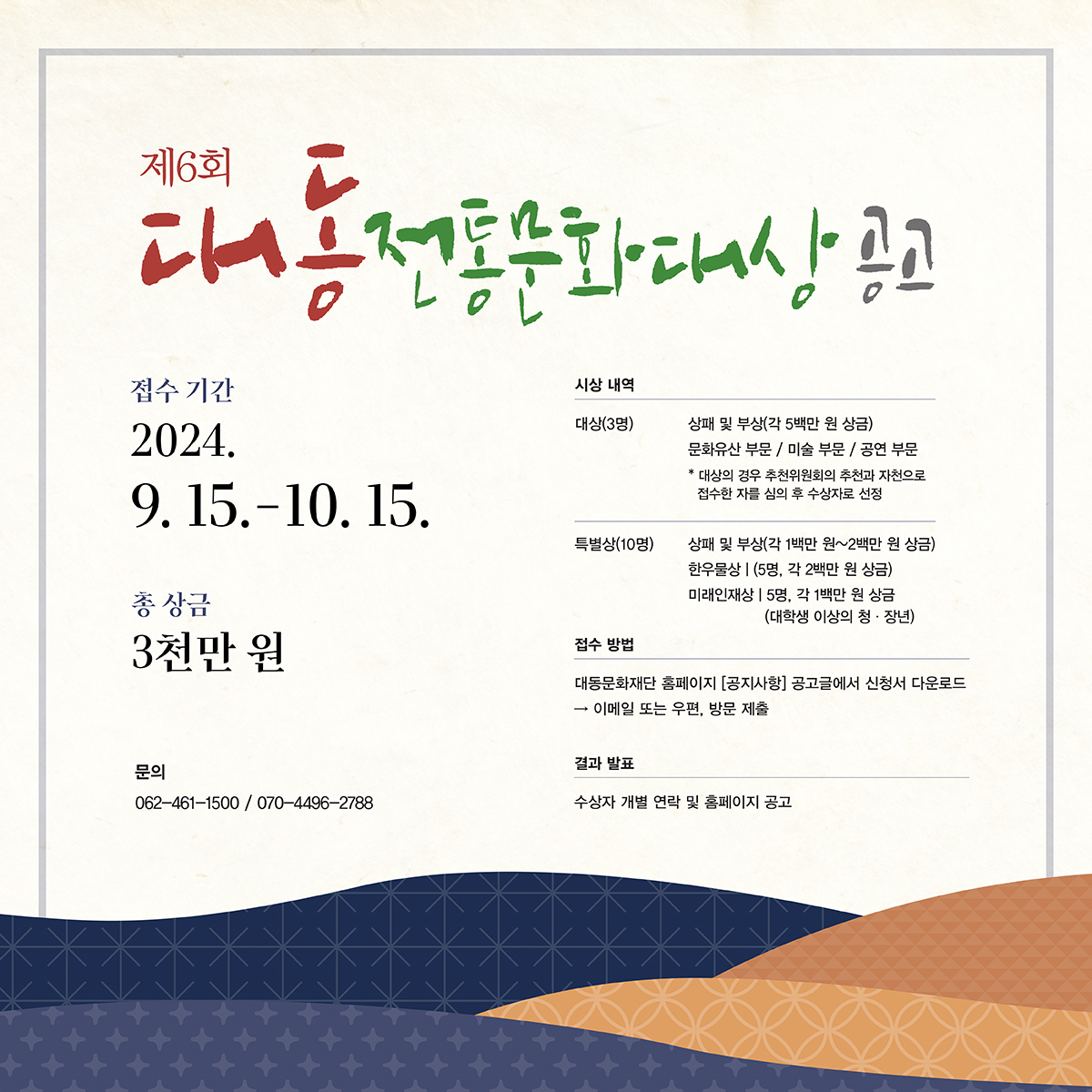 지난 9월 10일, 경주에서 열린 세계국가유산산업전에 대동문화재단도 참여했습니다! 국가유산지킴이 부스의 1일 지킴이가 되었는데요! 국가유산지킴이 활동을 많은 분들에게 소개할 수 있는 뜻깊은 시간이었답니다. 10월에는 속초에서 국가유산지킴이 전국대회가 개최됩니다! 국가유산을 지키는 아름다운 손길, 그 릴레이를 계속 지켜봐주세요🤲