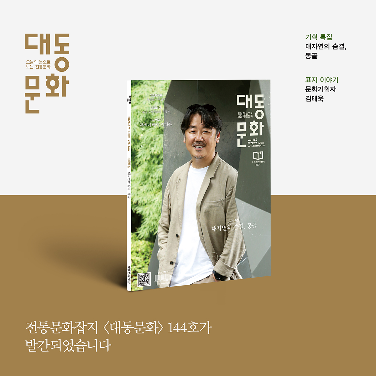 전통문화매거진 <대동문화> 144호가 발간되었습니다. 이번호 특집에서는 '대자연의 숨결, 몽골'이라는 주제로 몽골의 자연과 역사, 문화를 탐방하는 시간을 마련했습니다. 표지이야기에서는 문화기획자 김태욱 씨를 만났습니다. 추억의 충장축제 총 감독이기도 한 김태욱 기획자의 일 이야기를 만나봅니다!