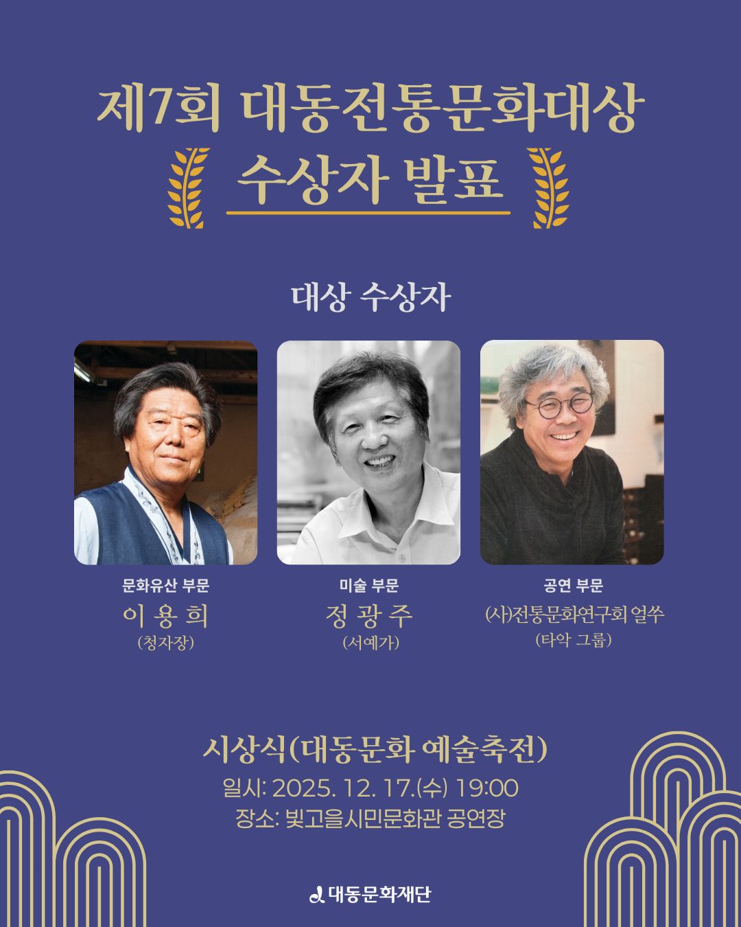 제7회 대동전통문화대상 수상자가 선정되었습니다. 대상 수상자는 문화유산 부문에 이용희 청자장, 미술 부문에 정광주 서예가, 공연 부문에 (사)전통문화연구회 얼쑤(대표 김양균)이 선정되었습니다. 그 외에도 한우물상(5명), 미래인재상(5명), 특별상-석봉문학상(1명)이 선정되었는데요. 모든 수상자분들께 축하와 감사 말씀을 전합니다.
