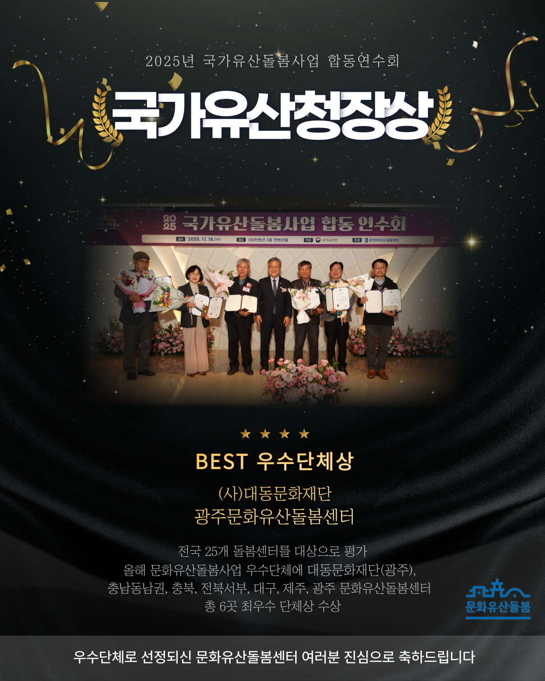 지난 11월 19일 대전 KW컨벤션에서 열린 '2025년 국가유산 돌봄사업 합동 연수회'에서 광주문화유산돌봄센터(대동문화재단)가 우수단체로 선정되어 국가유산청장상을 수상하였습니다! 또 임영열 경미수리 팀장은 개인유공자로 표창을 받았습니다. 광주 문화유산을 지키는 돌봄센터의 활약을 앞으로도 응원해주세요!👏👏👏