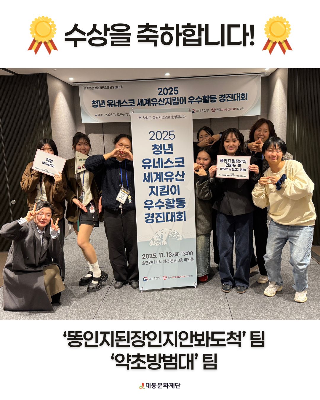 지난 11월 13일, '2025 청년 유네스코 세계유산 지킴이 우수활동 경진대회'가 열렸습니다! 전라·제주권에서는 장 담그기 문화로 활동한 '똥인지된장인지안봐도 척'팀과 동의보감으로 활동한 '약방'팀이 진출해 그동안의 활동 내용을 발표했습니다. '똥된장'팀은 최우수상을, '약방'팀은 유네스코 아태무형유산센터 사무총장상을 수상했습니다!!