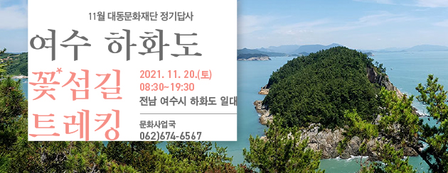얼마만에 띄워보는 안내 문자인지 모르겠습니다. 매달 주말 중 하루, 후원회원분들과 또 시민여러분들과 함께 아름다운 자연 경관을 찾아, 또 우리의 문화를 찾아 답사여행을 떠났던 때가 아득합니다. 조심스럽게 '일상회복'을 준비 중인 지금, 11월 정기답사를 준비해보았습니다. 여수 하화도 꽃섬길을 트레킹하는 실외 코스 위주의 답사입니다. 답답하고 지친 마음을 이름도 어여쁜 하화도에서 풀어봅니다.